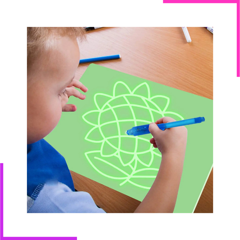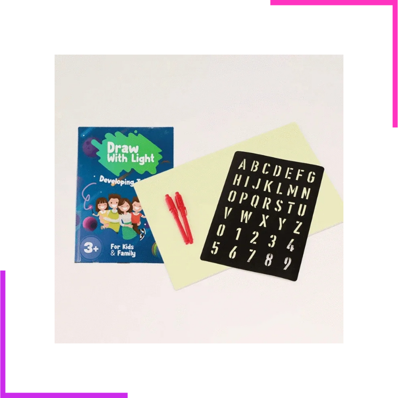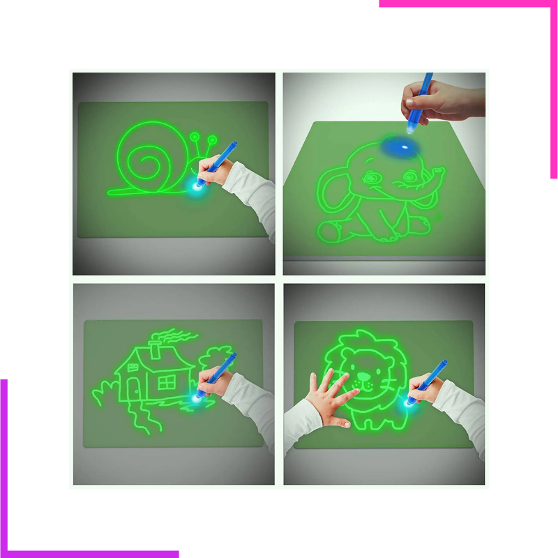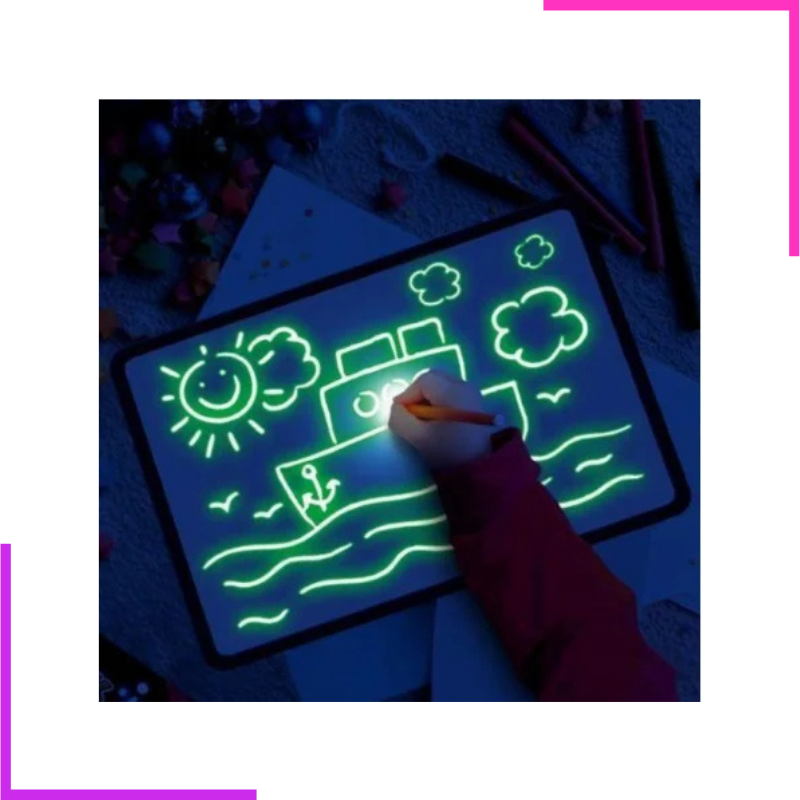 Offrez à votre enfant une nouvelle façon de dessiner grâce à cette ardoise magique qui brille dans le noir ! Avec son stylo LED, chaque trait s'illumine pour créer des dessins lumineux fascinants qui disparaissent progressivement, prêts à accueillir une nouvelle création. Une expérience sensorielle captivante qui stimule l’imagination, la motricité fine et la créativité, sans taches ni papier gaspillé.