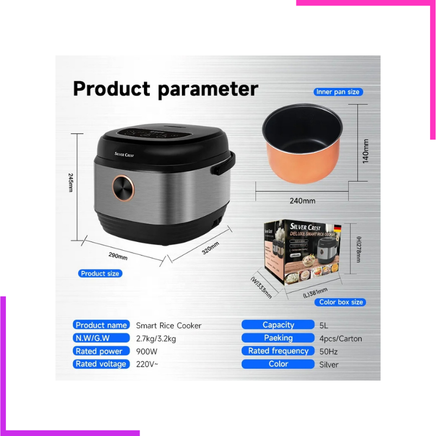 Préparez vos repas en toute simplicité avec le cuiseur à riz intelligent Silver Crest. Doté d'une capacité généreuse de 5 litres, il est idéal pour les familles nombreuses ou les amateurs de batch cooking. Son design moderne en acier inoxydable s’intègre parfaitement dans toutes les cuisines, alliant style et robustesse.