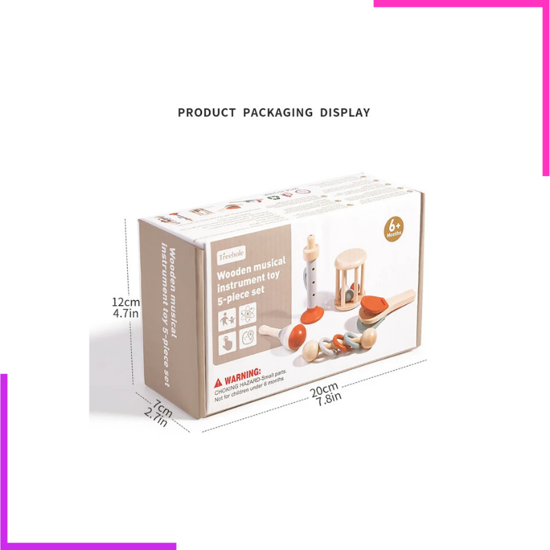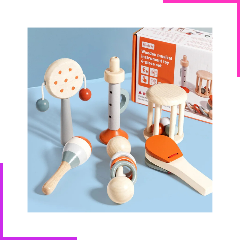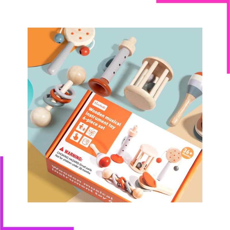 Offrez à votre bébé ses premières expériences musicales avec cet adorable set d'instruments en bois. Conçus spécialement pour les petites mains, ces jouets stimulent la motricité, l'éveil auditif et la coordination tout en favorisant l’imagination !