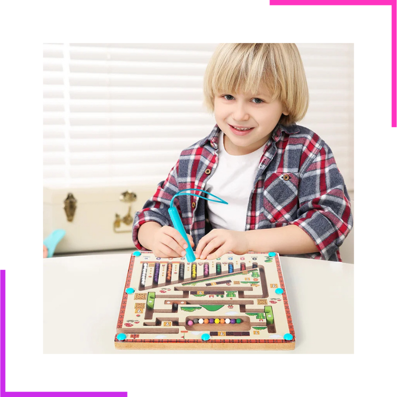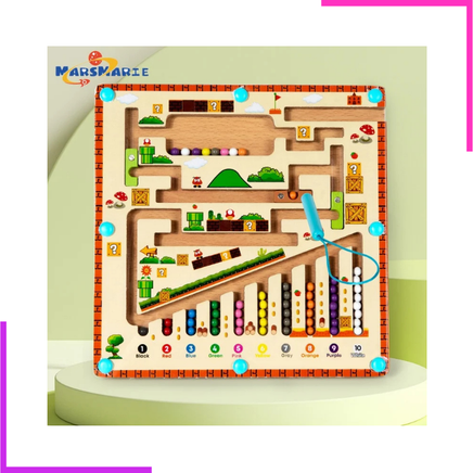 Stimulez l'apprentissage tout en vous amusant avec ce magnifique labyrinthe en bois inspiré d’un univers de jeu vidéo iconique ! Grâce à son stylet magnétique, votre enfant guide les billes colorées à travers le parcours, pour les trier par couleur et nombre.